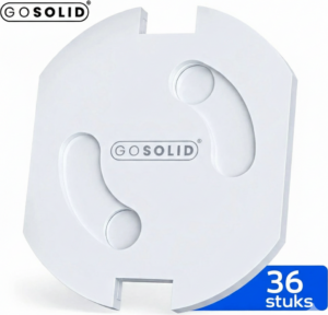 Pack com 36 protetores de tomada GO SOLID! na cor branca. Instalação fácil: sistema encaixável que bloqueia o acesso aos contatos elétricos. Material robusto e resistente a crianças, design discreto para a casa. Compatível com tomadas padrão, ideal para bebés e crianças pequenas.