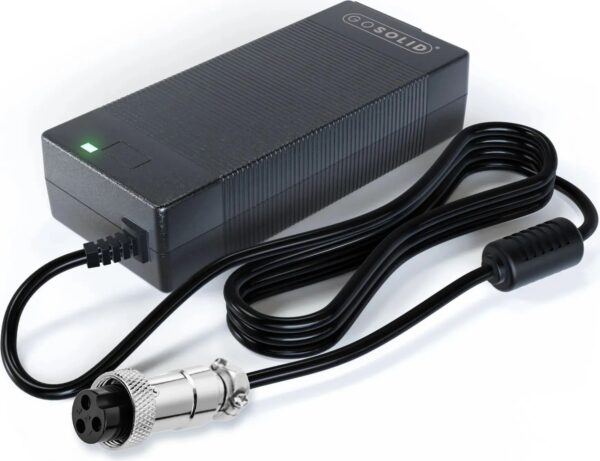 Carregador GO SOLID! compacto para trotinetes elétricos. Construção leve e resistente, conexão estável e controlo inteligente de corrente para carregamento seguro. Carregador de substituição compatível com iENYRID A1. Ideal como carregador extra ou de reserva para carregamento fiável e maior vida útil da bateria.